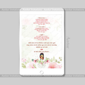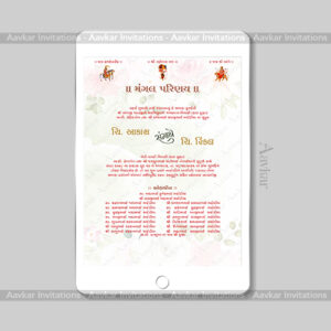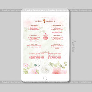 The design elements, featuring intricate flowers, evoke the richness of the Hindu culture and traditions. Tailor this invitation to your preferences with language customization options in Gujarati, Hindi, Marathi, and English, ensuring your message is conveyed perfectly.